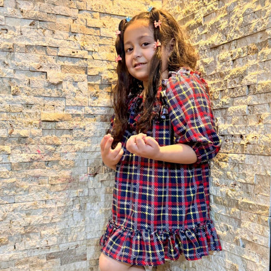 Dark Blue Tartan Wool Top – Ruffled Body & Shoulders with Elastic Sleeves