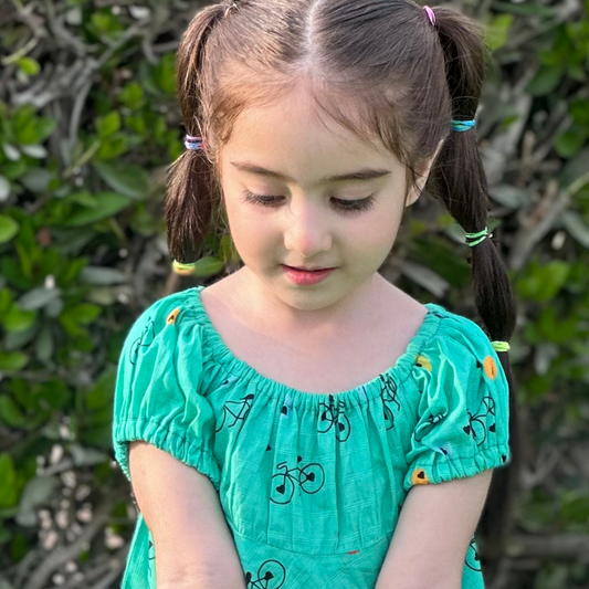 Bicycle Print Cotton Lawn Frock – Off-Shoulder Elastic Neckline, Short Puff Sleeves