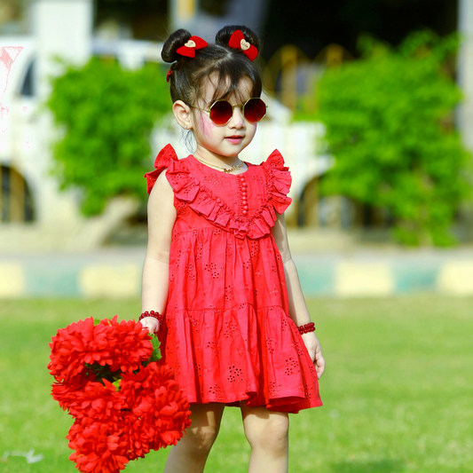 Carrot Red Chikankari Frock – Soft Cotton, Layered Design