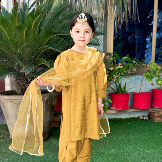Mustard Royale , Soft Cotton Raw Silk Dhani Shirt & Shalwar Set for Eid