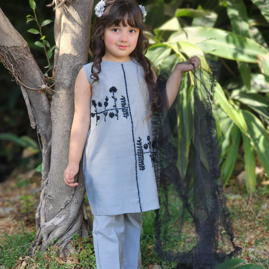 Grey Cotton Raw Silk Shirt & Trouser – Black Embroidered Mesh Detailing, Soft Glossy Finish